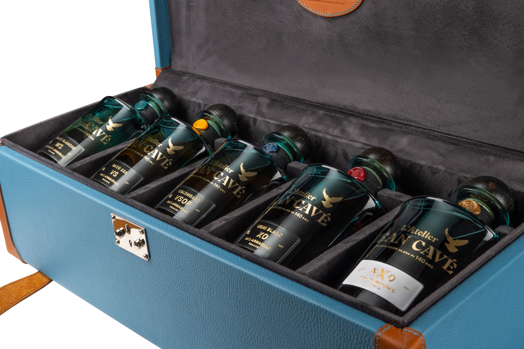 Plus qu’un voyage, cet écrin unique de cuir grainé bleu et marron réalisé par la Maison Bordelaise Alexandre Mareuil enferme ce que la Gascogne à de plus précieux depuis plus de 700 ans : l’Armagnac. Ces élixirs sont enfermés dans bouteilles dont la base est marron et le haut bleu pour rappeler le terroir vallonné de la Gascogne, et, son ciel bleu.